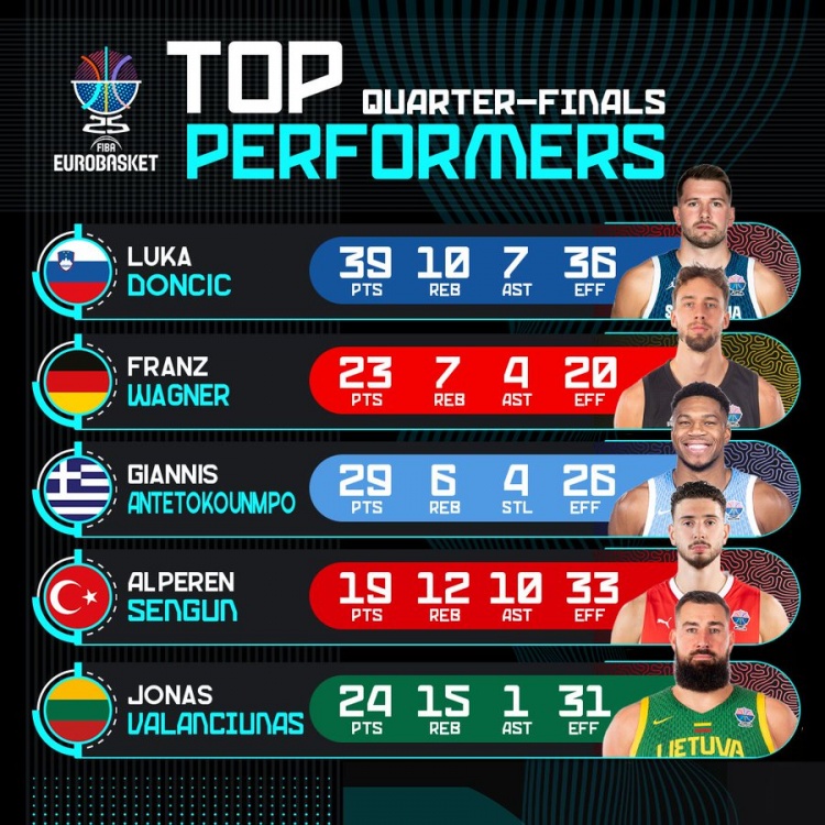 4场对决结束后,欧锦赛官推晒出了8强战中的球员高光表现:
